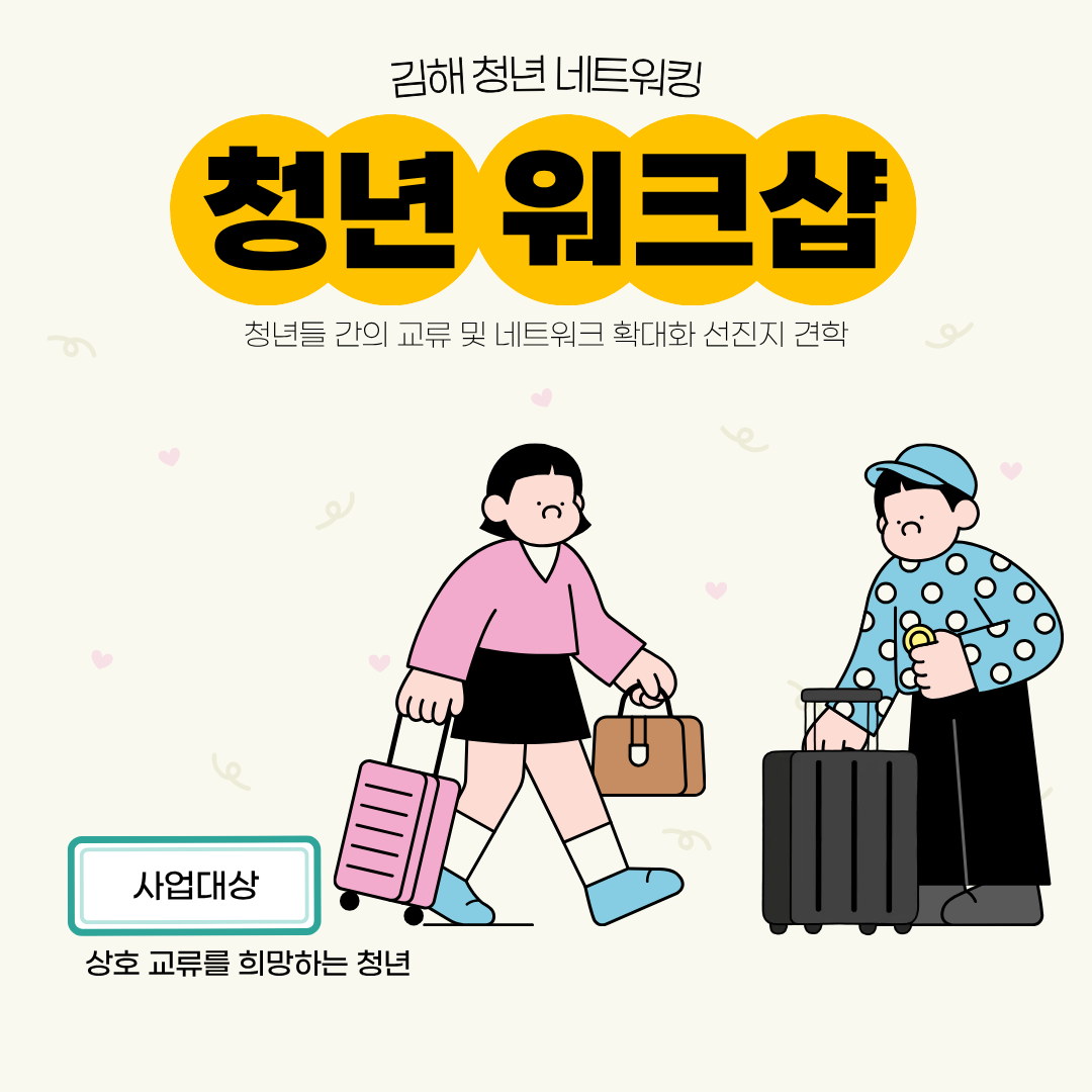 청년 워크샵 페이지 정보 본문 사업명 청년 워크샵 사업목적 청년들 간의 교류 및 네트워크 확대화 선신지 견학 사업대상 상호 교류를 희망하는 청년 사업기간 2026년 5월 ~ 11월 사업내용 주제별로 한 워크샵 운영을 통해 청년의 성장과 상호 교류를 지원하고 지역 내 청년 네트워크 확대 사업신청 둘러보기 김해시 청년들의 네트워크 형성을 도와드립니다! Station-G 청년다옴 : 055-310-9292