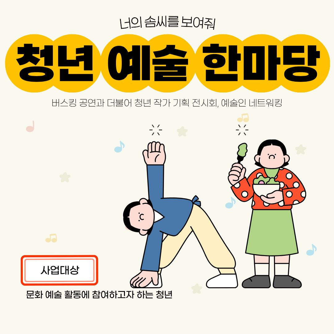 사업내용 청년 예술가의 공연, 전시 등 창작 활동을 지원하여 문화예술 참여 기회를 확대하고, 청년 문화 기반 조성 도모